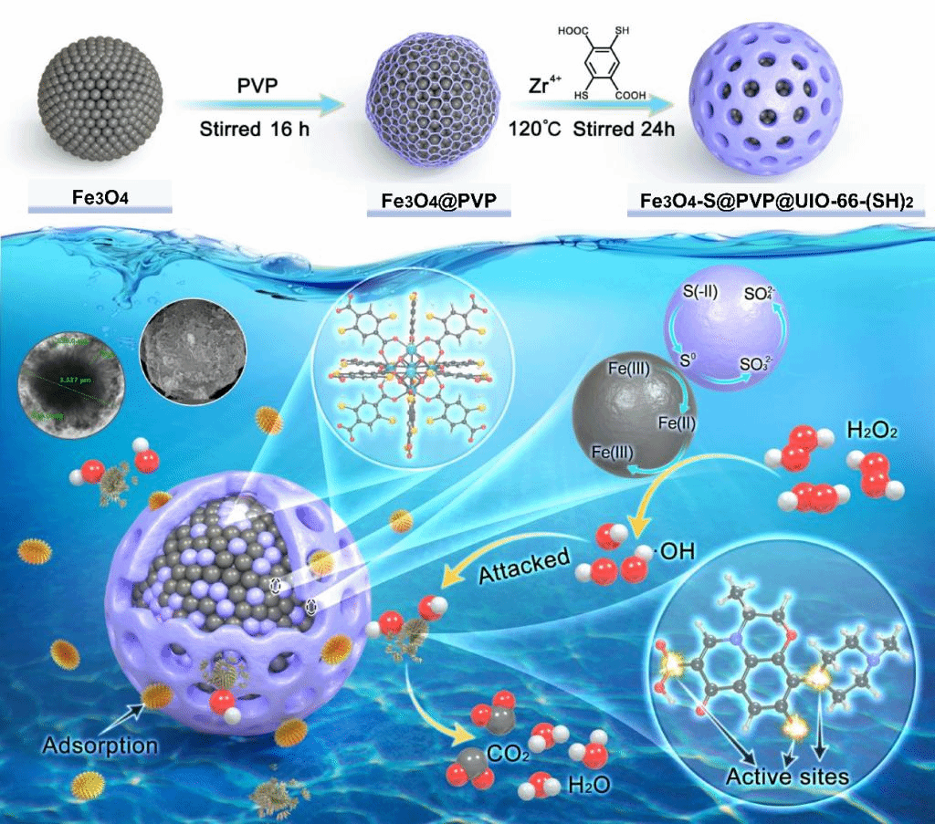 动物科学技术学院、动物医学院精准兽药创制与环境消减技术开发团队设计了具有核壳结构和硫掺杂特征的多功能金属有机骨架材料,实现了对抗菌药物的高效吸附和协同降解。相关成果以“S-doped core-shell heterojunction Fenton catalyst (Fe3O4-S@PVP@UIO-66-(SH)2) for enhanced activation of hydroxyl radical: synergistic enrichment and degradation mechanism”为题发表在Chemical Engineering Journal上。本研究通过在四氧化三铁团簇内外同时生长巯基化锆基金属有机骨架,构建了具有高效吸附性和过氧化氢活化性能的多相芬顿催化纳米材料,同时结合理论计算与试验结果系统地探究了引入非金属克服铁活性位点失活的机制。