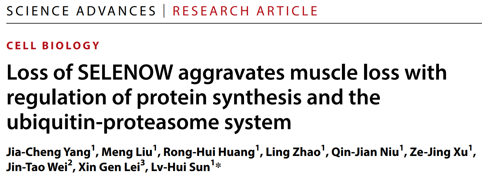 孙铝辉教授课题组在《Science Advances》期刊上发表了题为“Loss of SELENOW aggravates muscle loss with regulation of protein synthesis and ubiquitin-proteasome system”的研究论文。该研究首次揭示了硒蛋白W(SELENOW)在肌肉萎缩中的重要功能及机制。
