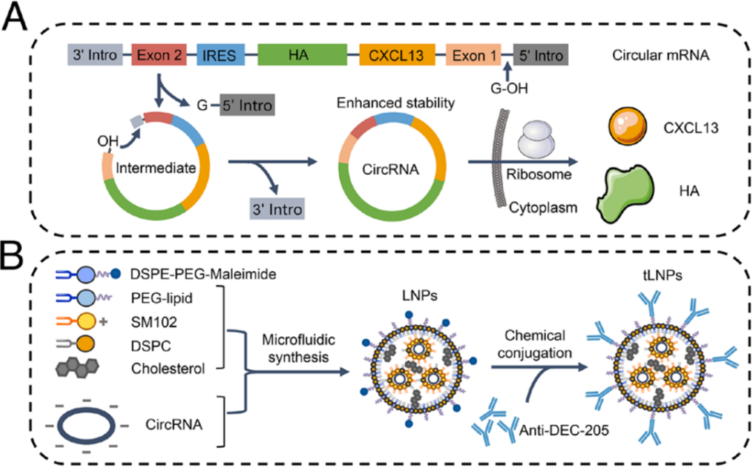 环状RNA是一种具有独特共价封闭结构的RNA分子,能够防止被外切酶降解,具有比传统线性mRNA更高的稳定性。这一特性弥补了普通mRNA疫苗在稳定性方面的不足,赋予其更广阔的应用前景。这种稳定的结构使得环状RNA能够更有效和持久地表达治疗性蛋白质或肽,展示了在疫苗研发和蛋白质替代疗法中的巨大潜力。