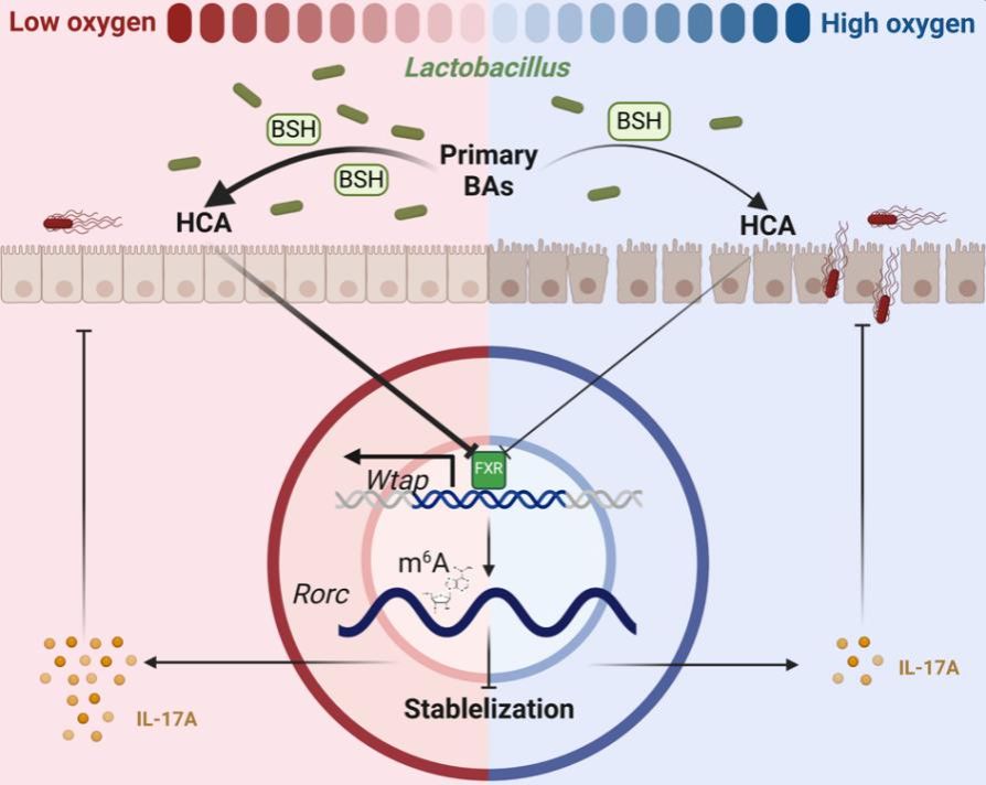 众所周知,肠道氧环境是肠道菌群的重要塑造者。该团队研究发现,通过消耗新生仔猪肠道氧气,可促进肠道微生物定植和成熟,从而加速肠道免疫发育和抗病力形成,是提高仔猪肠道健康状态的重要手段,但具体作用机制尚未阐明。针对上述问题,该团队鉴定出罗伊氏乳杆是促进肠道3型免疫细胞发育的关键微生物。罗伊氏乳杆菌高表达胆盐水解酶,将初级胆汁酸代谢生成猪胆酸,通过抑制法尼醇X受体来下调甲基转移酶WTAP表达,降低RORγt的RNA m6A修饰并提高其mRNA稳定性,从而促进γδT17和ILC3细胞的发育。通过在新生期补饲兼性厌氧菌消耗肠道氧气来增加罗伊氏乳杆菌丰度,或者直接补饲罗伊氏乳杆菌均能有效提高肠道抵抗病原菌感染能力,显著降低死亡率。