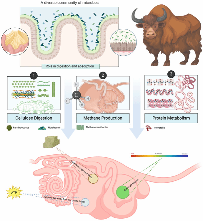 Key findings: Yak gut microbiota exhibit striking seasonal plasticity, reflecting the forage-mediated shift in the functional metagenomic pathways of lignocellulose degradation, nitrogen assimilation, and biosynthesis of SCFAs. Adding metabolic efficiency, microbiota-mediated modulation of mTOR and hypoxia-inducible factor-1α pathways underlines their role in energy homeostasis, lactation performance, and reproductive physiology. These findings have established the unrivaled ecological versatility of the yak microbiota and their potential to improve methane mitigation and sustainable livestock management. The development of host-microbiome metabolic modeling through priorities for functional redundancy and microbial synergy facilitates precision probiotics and climate-resilient livestock systems. This work has pointed out the knowledge gaps and underlined the transformative potential of yak microbiota in solving global challenges associated with food security and sustainable agriculture.