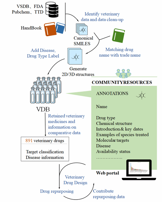 当前,国际数据库如Drugbank、Drugcentral、FDA GreenBook、VSDB等虽收录了部分兽药信息,但存在数据不完整、兽药与人药混杂、缺乏独立兽药检索入口等问题。Papich Handbook of Veterinary Drugs等专著虽提供临床兽药用药信息,却仅以文本形式呈现,缺失分子结构与靶点等关键数据。在国内,国家兽药基础数据库等更关注兽药行业监管、生产、使用,记录兽药产品的批准文号、生产批次、有效期,缺少分子水平信息整理。