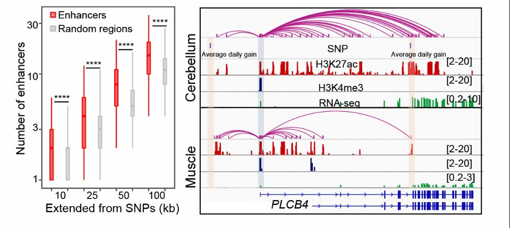 由于猪基因组调控元件与功能区突变挖掘滞后,导致猪基因组的功能位点与分子标记无法区分,基因组育种芯片设计时无法充分利用功能区域和功能位点信息,影响了基因组育种效率的提升。该研究通过整合调控元件、三维基因组及全基因组关联分析(GWAS)信息,解析了猪重要性状GWAS位点在调控元件周围的分布特征,对部分重要性状候选因果突变进行了鉴定,同时通过整合不同品种间基因组突变、表观修饰、三维基因组及基因表达变异,鉴定了一批具有潜在调控功能的重要SNP。以上成果为基因组育种技术创新及效率提升提供了丰富的数据信息,为加速猪经济性状遗传改良开辟了新路径。该成果以赵云霞副研究员、侯晔博士和博士生许月园为共同第一作者在线发表,相关工作获得国家自然科学基金和国家重点研发计划等项目资助。