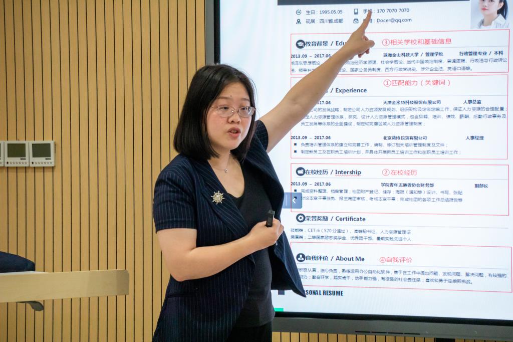 活动伊始,林文菲一一对参与人员的简历进行了初步的优化指导并询问了同学们关于简历制作最困惑的几个难题。她将简历制作分为“HR眼中的简历框架与结构”“HR教你简历的有效表达”和“HR眼中‘必死’的简历”三个部分进行讲解。