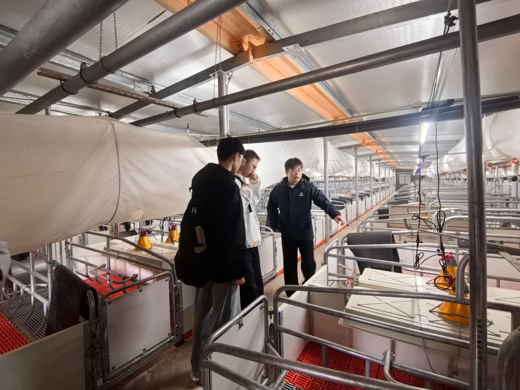 在养殖厂实地参观环节,同学们分批次走进了仔猪培养厂、母猪分娩厂、配怀厂和后备室。工作人员结合现场情况,讲解了不同养殖环节的技术要点、环境控制要求以及生产安全规范。工作人员还向同学们介绍了入厂流程、设备功能和注意事项。同学们就不同厂舍的设备差异和环境要求积极提出问题,对现代养殖企业的运作方式和人才能力要求有了更具象的认识。
