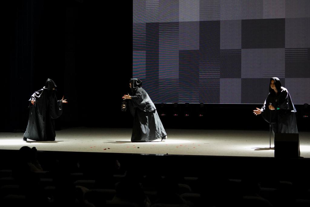 队的参赛话剧《麦克白》改编自英国剧作家威廉•莎士比亚的同名戏剧。《麦克白》作为莎士比亚“四大悲剧”之一,讲述了大将军麦克白受女巫预言蛊惑,在麦克白夫人的怂恿下弑王篡位,但其为巩固王位残暴屠杀、推行暴政最终被推翻的故事。参赛作品则选取了麦克白在三个女巫预言及夫人煽动下,下定决心弑君篡位的片段。第一幕以雷雨交加的荒原为背景,以代表命运的女巫三姐妹隐言开篇,为整个话剧表演笼罩了一层神秘的面纱。作品的高潮集中在麦克白的城堡中,通过麦克白夫人的独白以及用美貌和话语促使麦克白下定决心的情景,塑造了麦克白夫人既野心勃勃、渴望权力又充满智慧、关心体贴丈夫的复杂形象。