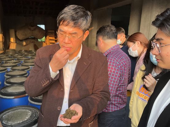 师生参观公司繁殖场和发酵饲料贮存间。通过监控视频和环绕繁殖场外围,何董就猪场结构布局、生物安全防范、饲养管理、无害化处理等方面的优秀举措与同学们展开交流,大家纷纷为公司卓越的生产成绩感到赞叹。在发酵饲料贮存间,何董介绍了公司独创的构树发酵饲料,该饲料有蛋白含量高、适口性好、耐储存、促生长效果佳等优点,是公司下一阶段发展的重点产品。
