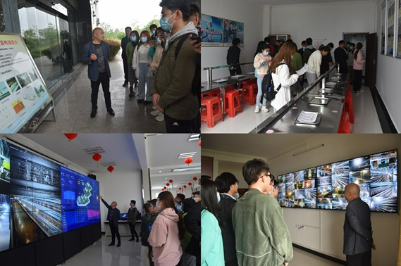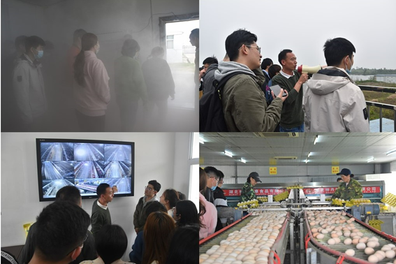 随后,华农师生一行到公司蛋鸡场参观标准化蛋鸡养殖场,王鹏场长向同学们介绍本场布局、栋舍设计、料塔和生蛋传送带、粪污处理方式,观看在线监控并讲解栋舍内部情况,还带领大家参观集蛋区,了解集蛋、洗蛋等实际工作流程。最后,学生们到公司蛋鸭场参观了畜禽养殖数字农业建设试点项目,由吴勇场长介绍蛋鸭场的综合信息平台、蛋鸭无水笼养模式等蛋禽业的最新智慧养殖技术。