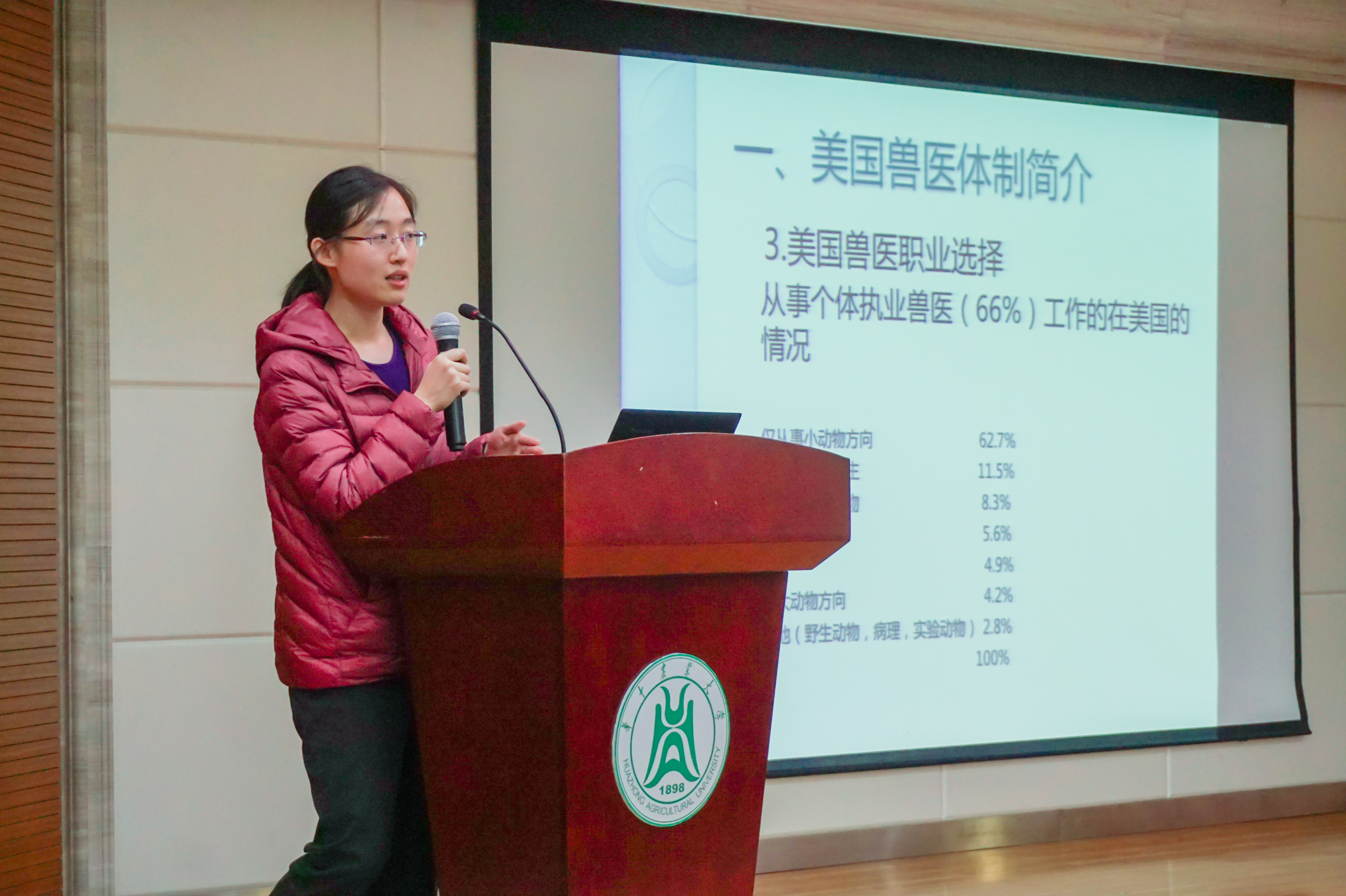 沈瑶琴围绕美国兽医体制简介、美中动物卫生中心项目、堪萨斯州立大学求学经历三大方面展开宣讲。沈瑶琴指出,在美国兽医专业的录取要求很严格并且之后的淘汰率也很高,但仍是有志大学生的良好选择;她同时也说到非兽医专业的学生只要学习了基础必修课程并达到相关要求也可以来修习DVM;此外,她还突出强调了沟通、合作的重要性,并鼓励我们多参加活动丰富自身的经历。