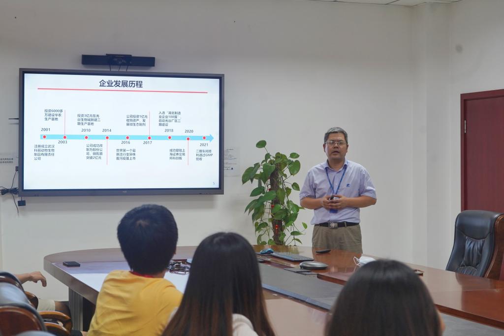 (通讯员:王紫霞 马珂 摄影:赵慧)7月4日下午,华中农业大学动物科学技术学院、动物医学院赴湖北省宜昌、荆州、武汉市暑期社会实践团来到武汉科前生物股份有限公司参观交流,董事长助理刘继东与实践团成员进行交流。