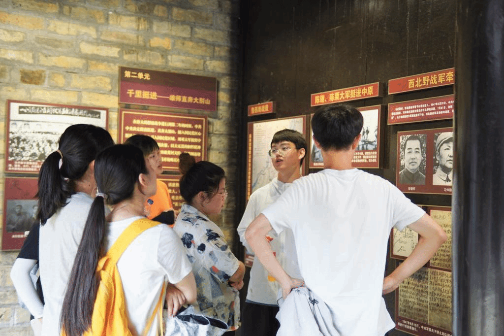 “宏图史长传,义在民心功在国;老宅春永驻,花常吐艳柏长青。”下午三时许,队员们来到刘邓大军千里跃进大别山指挥部旧址参观学习。走进“五进三幢”的老宅,轻抚青砖黛瓦的古墙,队员们的思绪穿梭到刘邓大军千里挥师大别山的解放前夜。指挥部旧址里的古墙上,一块块展板、一幅幅照片按照战役时间线整齐排列,翔实地讲述着刘邓大军千里跃进大别山的伟大壮举及其奋战历程。