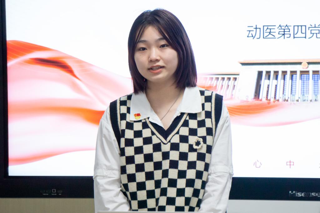 在PPT演讲环节,各位预备党员开展主题演讲。本科生动医第四党支部汪子怡以“C919大型客机成功研制”为出发点,从C919研制背景、名字由来、发展重大意义等三个方面展开叙述。“关键核心技术要不来、买不来、讨不来”,通过引用习总书记在C919研制工作会议上的重要讲话,汪子怡强调了探索自主创新之路的必要性。本科生动医第六党支部周士月则以“家庭教育”为主题,指出“家庭教育是一门科学”,在介绍家庭教育重要性基础上,她带领各预备党员学习培育家风的方法,并强调社会各界要扛起培育下一代的重任。