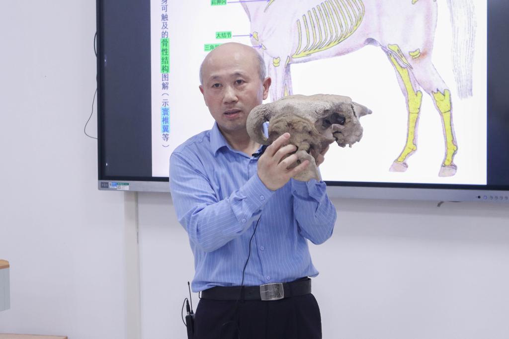 基础兽医系教授邱德新在四综A103教室给参赛小组进行赛前培训。他结合自己多年从教经验,将理论知识与实物想联系,系统介绍了牛骨骼特点。在互动环节,他鼓励大家在比赛过程中要自信、多思考,以一颗平常心态参加比赛。