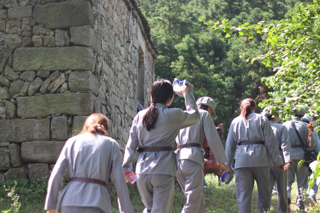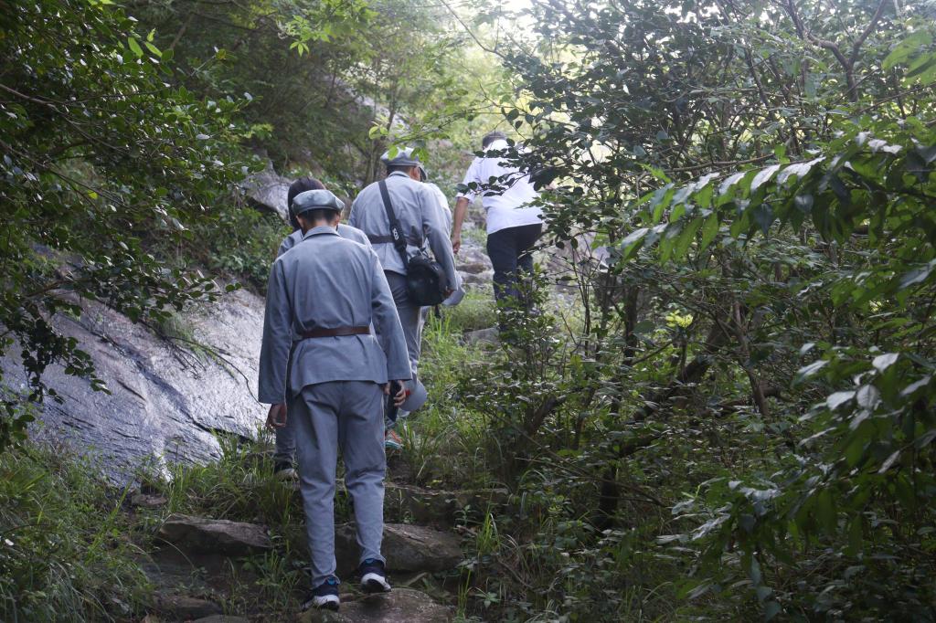 清晨,身着红军军装、头戴红军帽的队员们早早就到达了村部门口集合。在拍摄了两张合照后,“红军战士们”便开始跋涉大别山,重走长征路。闷热的衣服,高悬的烈日,陡峭的山路无疑是对支教队员们身体和意志的双重考验。出发后不久,队员们的衣裳便被汗水浸湿,脚下开始打颤、发软。“很难想象前辈们是如何在敌军的围剿和艰苦的环境中坚守信念,最终完成两万五千里长征的”支教队员梁晓怡在行军过程中不禁感慨道。