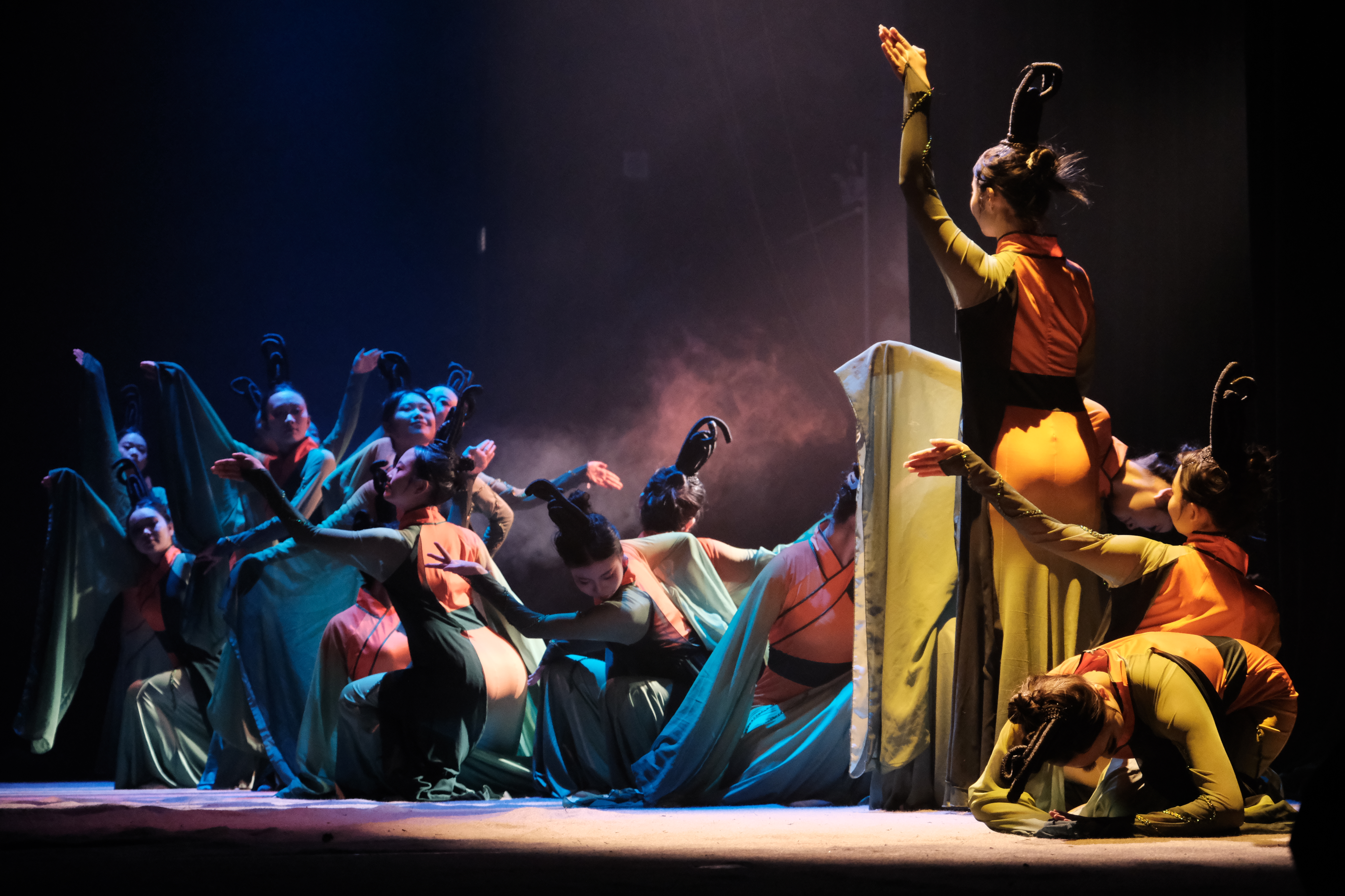 舞蹈团携一曲《橘颂》压轴登场。“后皇嘉树,橘徕服兮;受命不迁,生南国兮。”动科动医舞蹈团的同学们身着青黄渐变的舞蹈服饰,头盘发髻似果蒂。舞者们踏着相同的节奏韵律,跟随音乐塌腰撅臀、翘袖折腰,时而整齐划一,时而错落有致,动静结合,行云流水,完美展示了“楚腰”阿娜多姿的舞蹈形态。她们笑不露齿,用眼神传递内心情绪,通过翩翩舞步散发温婉含蓄、典雅端庄的气质。舞台光影流转,表演者的每一个动作和微笑都是对舞台的热爱和追求,都展现了动科动医学子为探求真理上下求索、矢志不渝的精神品格。