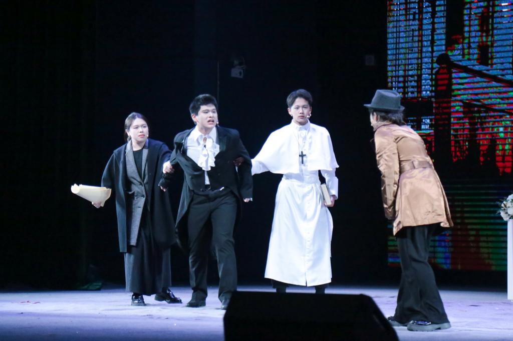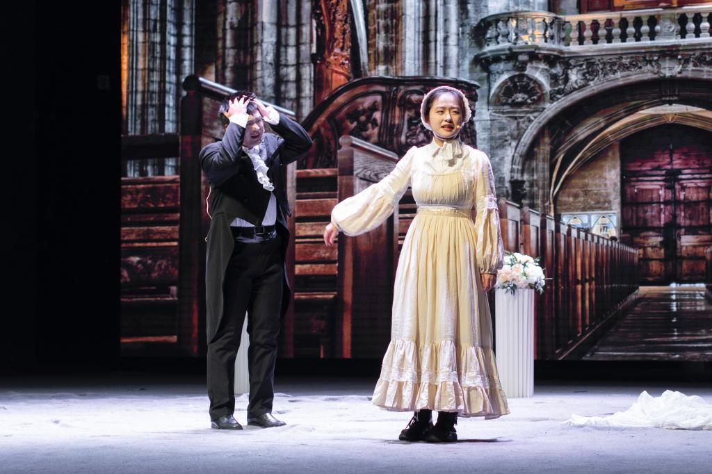 队的参赛话剧《简·爱》改编自英国作家夏洛蒂·勃朗特的同名小说,节选了“求婚现场”“婚礼剧变”两个经典桥段。第一幕以晴空万里的庄园做背景,女主角简·爱即将离开,男主角罗切斯特强势挽留并深情告白,最后求婚成功收尾。第二幕则是在婚礼现场罗切斯特被人检举早已有了妻子,最后简·爱伤心离去落幕,与第一幕浪漫的氛围形成了强烈对比。男主角罗切斯特最后痛苦的,对父亲以牺牲他的幸福而换取财富的反抗的嘶吼。女主角简·爱所表现出的独立的灵魂,塑造了不屈于现状、敢于抗争的女性形象。