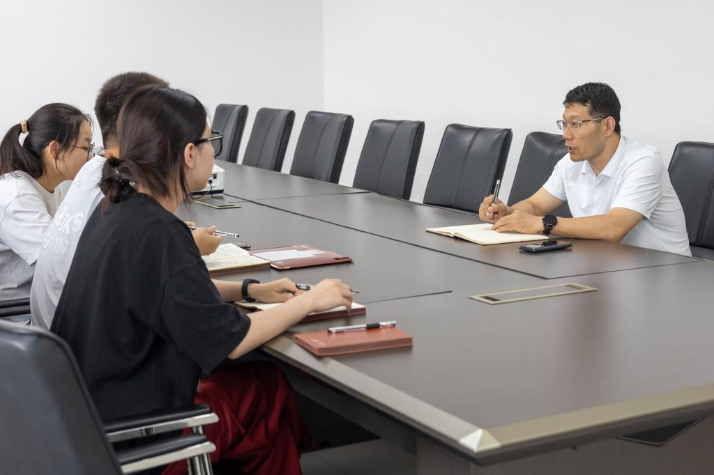 赴河北利华药业实践团队员在三楼会议室对利华药业总经理宁振兴展开人物专访。宁振兴亲切和蔼、幽默风趣,整个访谈过程非常轻松愉快。