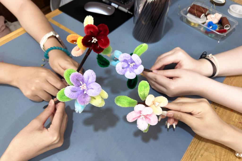 实践团队们联系到南京云青艺雨手工工作室,在王进老师的指导和帮助下开始了绒花发簪的制作。王进首先为团队成员讲解制作要点。她将簪子比作树干,成员们之后要做的是树上的“花朵”和“叶子”。“树干”是一定的,而“花朵”和“叶子”的大小、颜色、生长位置等都是由制作者选择的。王进这一番话向团队成员传达出手工作品“由心而生”的理念。听过简单讲解后,成员们开始上手操作,主要完成的是打花与包装两个步骤。大家在工作室内舒缓的音乐中静下心来,沉浸在抽绒、缠线、组装各个步骤中,碰到较难操作的地方主动向老师求教,场面一派和谐。