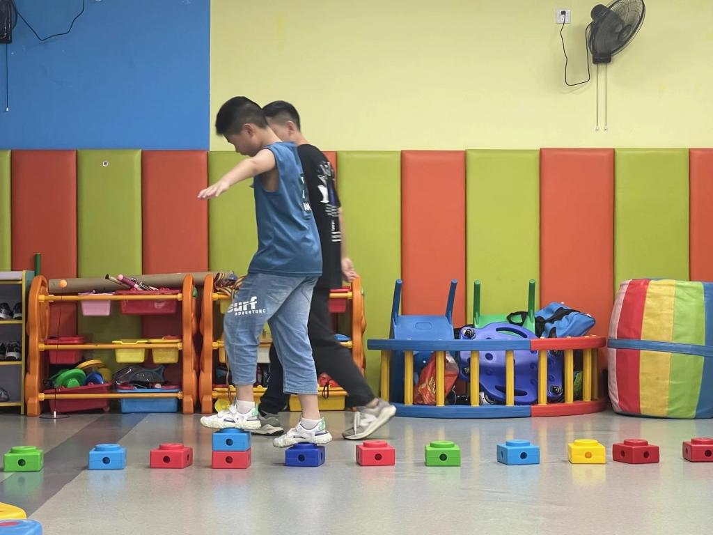 在康复中心的感统室一共分为四个区域:平衡训练区、视觉训练区、跳跃训练区和触觉训练区。针对不同程度的学生,老师会采取不同的教学方式:能力较强的学生仅通过示范行为就可以自觉完成模仿,而能力相对较弱的学生则需要通过半辅助或完全辅助的方法,利用指示性语言带领完成训练。