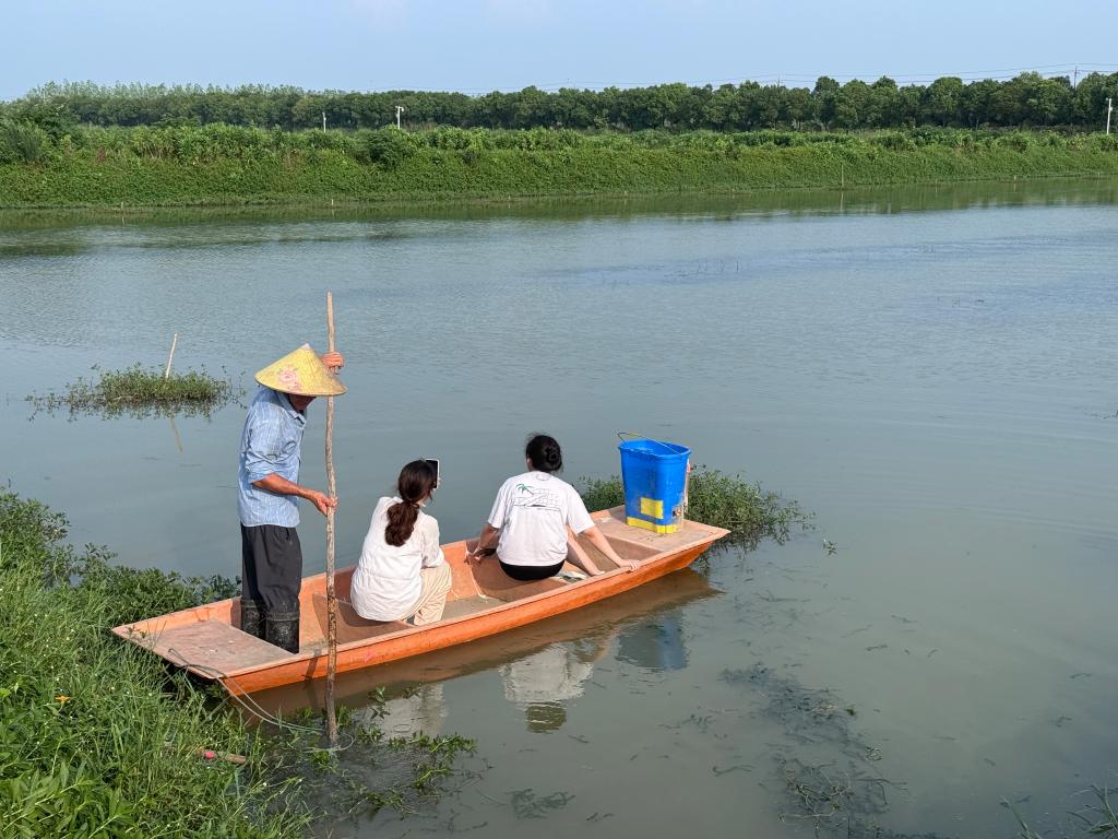 实践团队成员张雨彤和陈星也在胡师傅的带领下体验了播撒龙虾饲料的过程。船头的蓝色小桶是虾饲料播撒器,打开开关后即可播撒范围为半径三米的虾饲料。播撒过程中胡师傅提到,该模式不仅实现了环境保护,还提高了农业生产效益,是一种高效、环保的农业生产体系。