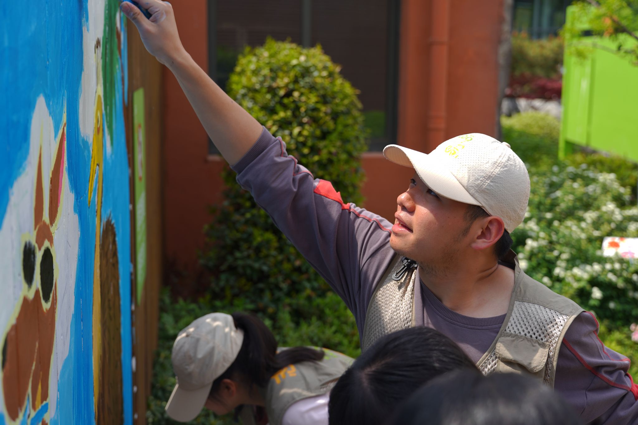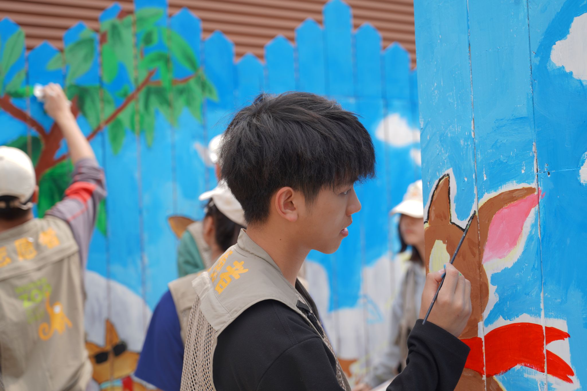 4月5日上午9时,牧医阳光志愿服务队与江汉大学、湖北中医药大学志愿者在负责人带领下集合,挑选材料后前往绘画区域。经过协商分工,志愿者们开始描绘以人与自然和谐共处、保护生物多样性为主题的画稿。活动过程中,志愿者们紧密协作,分组搬送颜料,相互学习绘画技巧,用心创作。经过6小时的努力,一幅蓝绿交织的墙绘作品完成,给动物园大洋洲区域增添了一分色彩。