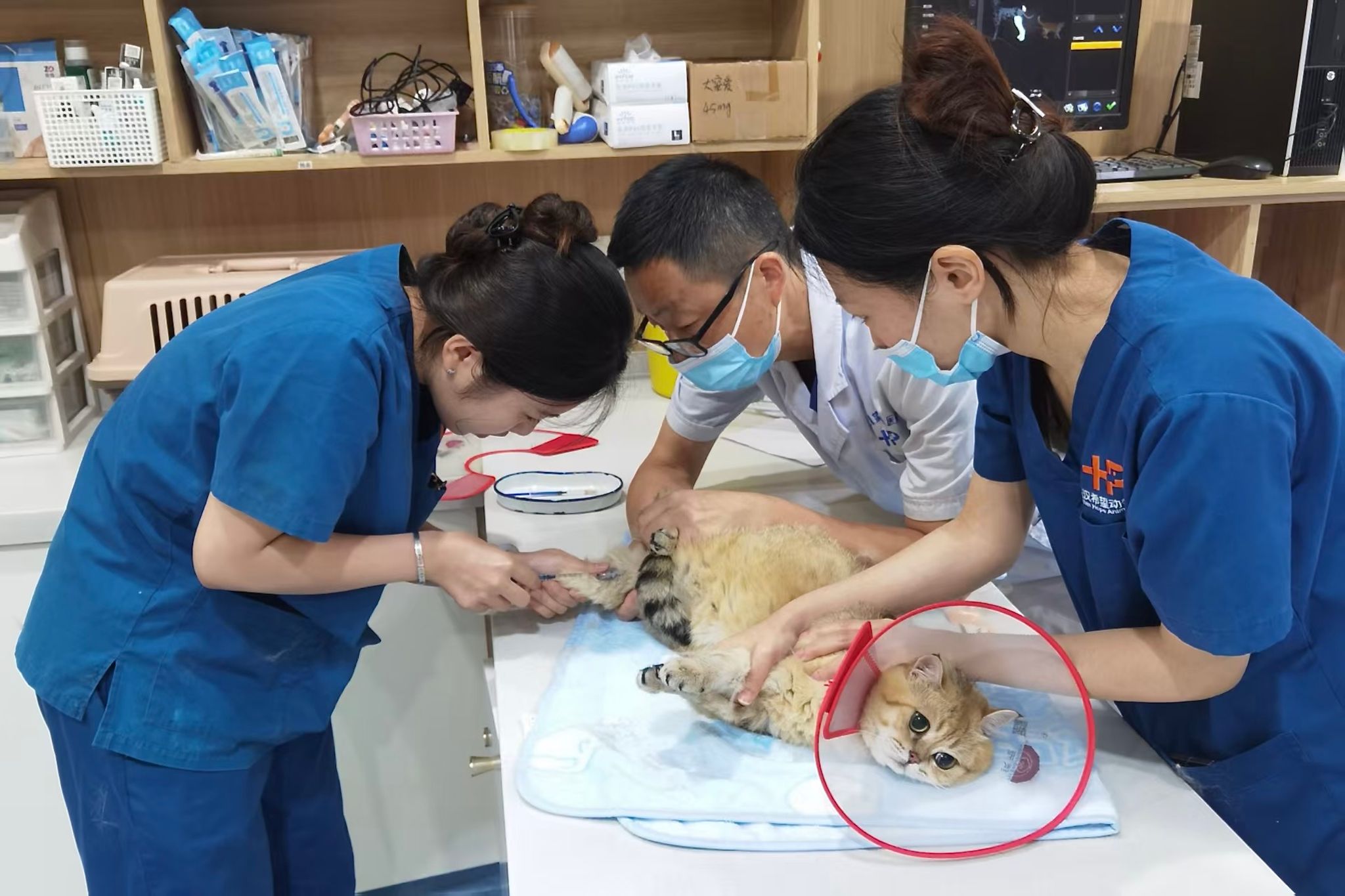 手术台上,一只极具攻击性的待绝育公猫成为特殊教学案例。面对猫咪剧烈挣扎、利爪挥击的危险情形,柯医生与一名助理默契配合,采用专业保定手法精准控制猫体,同时以温和语气持续安抚动物情绪;另一名麻醉助理则快速定位注射部位,以"稳、准、快"的专业手法完成麻醉剂精准注射。整个处置过程仅耗时2分30秒,充分展现出医护团队扎实的解剖学功底、熟练的临床操作技能及临危不乱的职业素养。这一案例教学让实践团深刻认识到,兽医工作不仅需要深厚的专业知识储备,更需具备对动物行为的敏锐判断、突发事件的应急处理能力及对生命的敬畏之心。