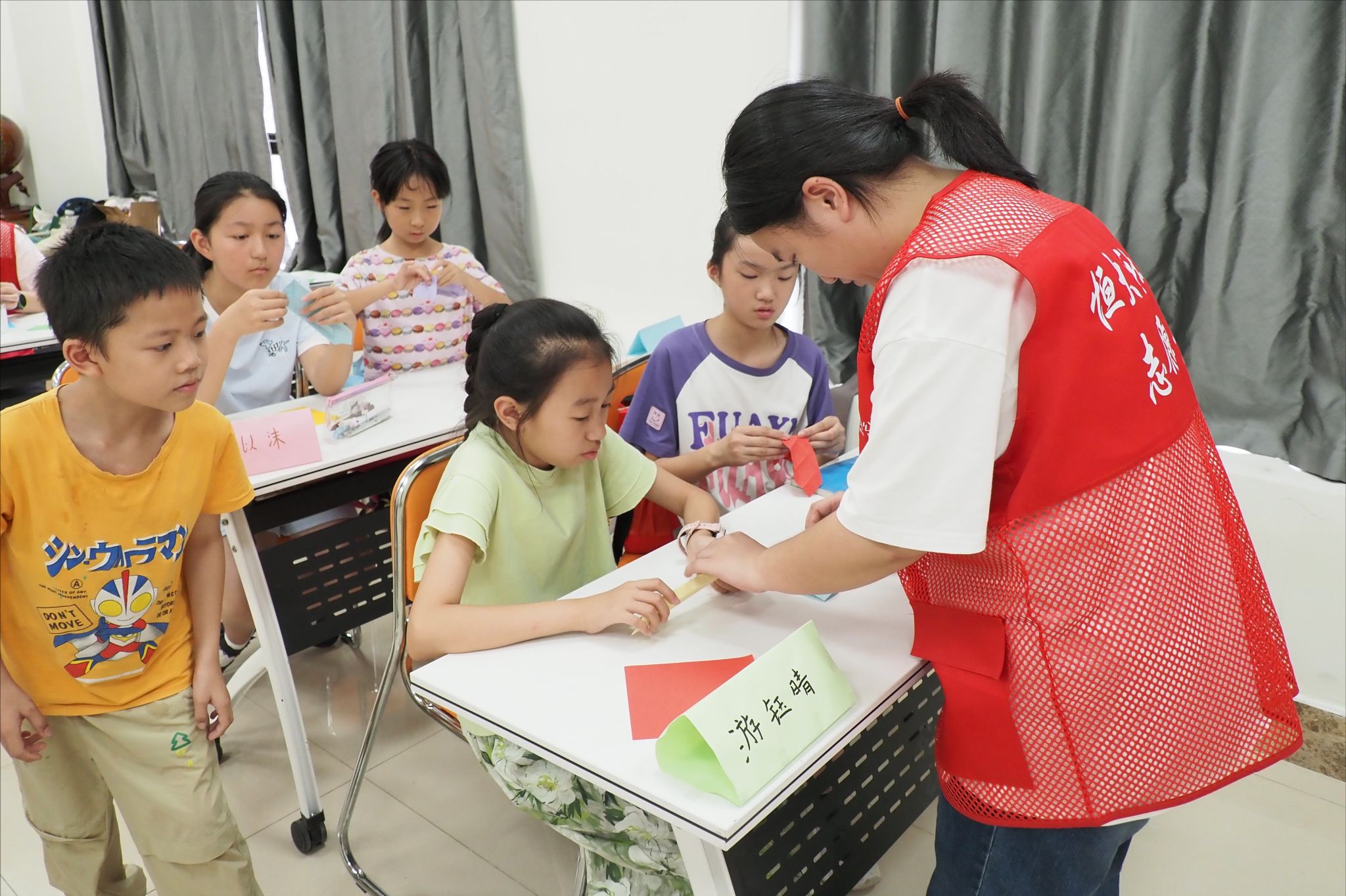 当日下午,实践团成员郭鸿洋、彭晓愉牵头开展创意折纸工作坊,与团队成员共同教授托管班儿童制作“弹力蛇”“玫瑰”等折纸作品,鼓励孩子们将成品赠予亲友,助力培养其情感表达与社交能力。在队员指导下,孩子们边思考边操作,按步骤将彩纸折成目标形状。因“弹力蛇”折法步骤多、难度大,不少孩子向队员求助完善作品。三年级学生游同学表示:“弹力蛇很难做,在赵紫晴姐姐帮助下完成后,特别有成就感。”