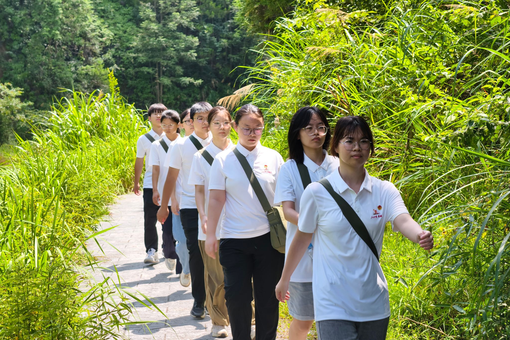 上午十点,实践团抵达八角楼旧址区域,完成集结后,踏上重走毛主席转移路征程。行军路线起伏剧烈,陡升骤降。道路由平坦逐渐变得崎岖泥泞,部分路段狭窄陡峭,行走困难。面对湿滑的下坡和散落的碎石,实践团成员王嘉怡感叹:“现在修缮过的道路都这么难走,当年红军战士该是冒着多大风险前行的啊!” 实践团在密林中迂回穿行,汗水浸透衣背,沉重的喘息与坚定的脚步交织成特殊的行军乐章。经过近两小时的行进,实践团克服重重困难,成功抵达马源村居委会,用双脚丈量了信仰的力量。