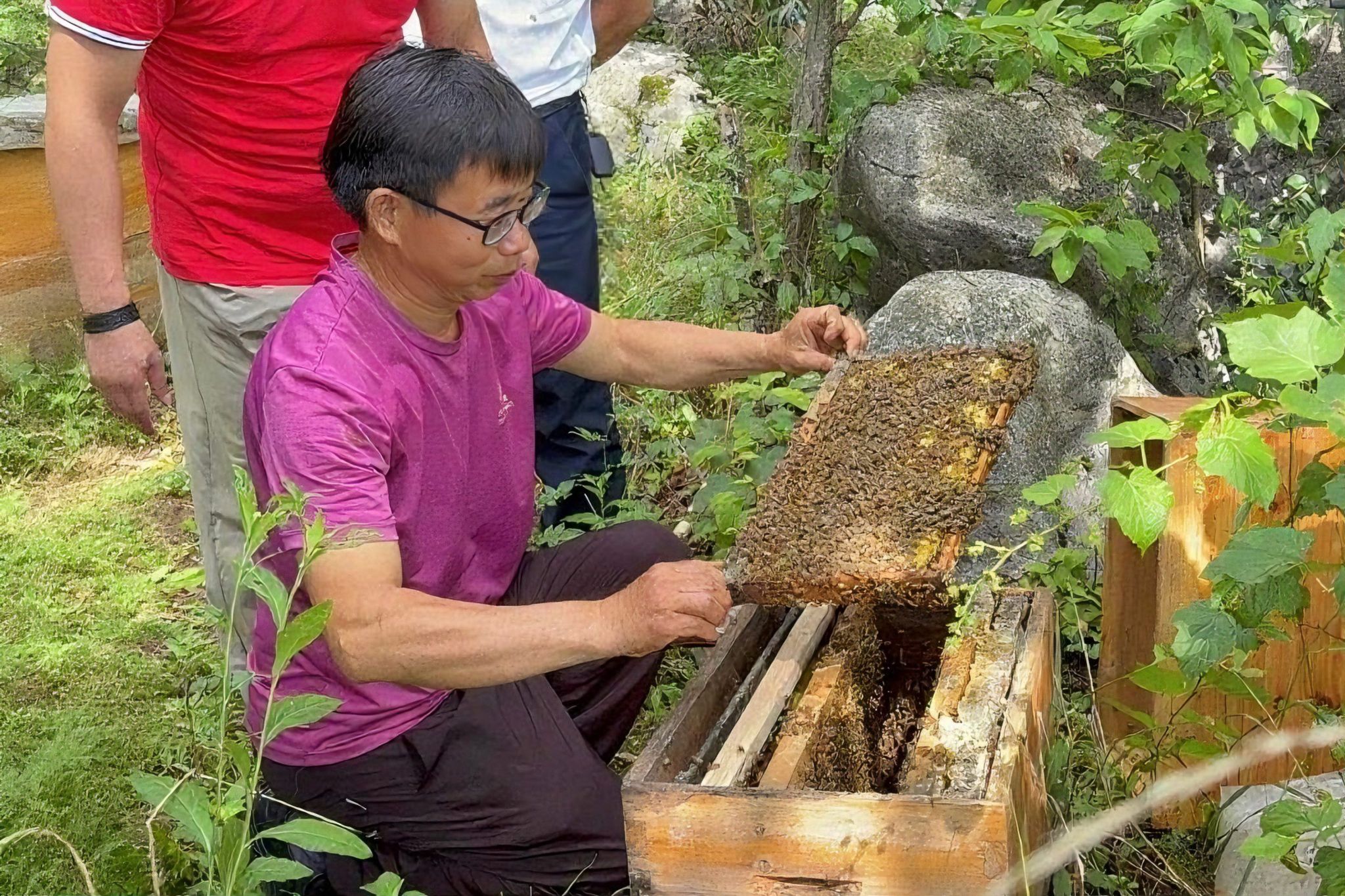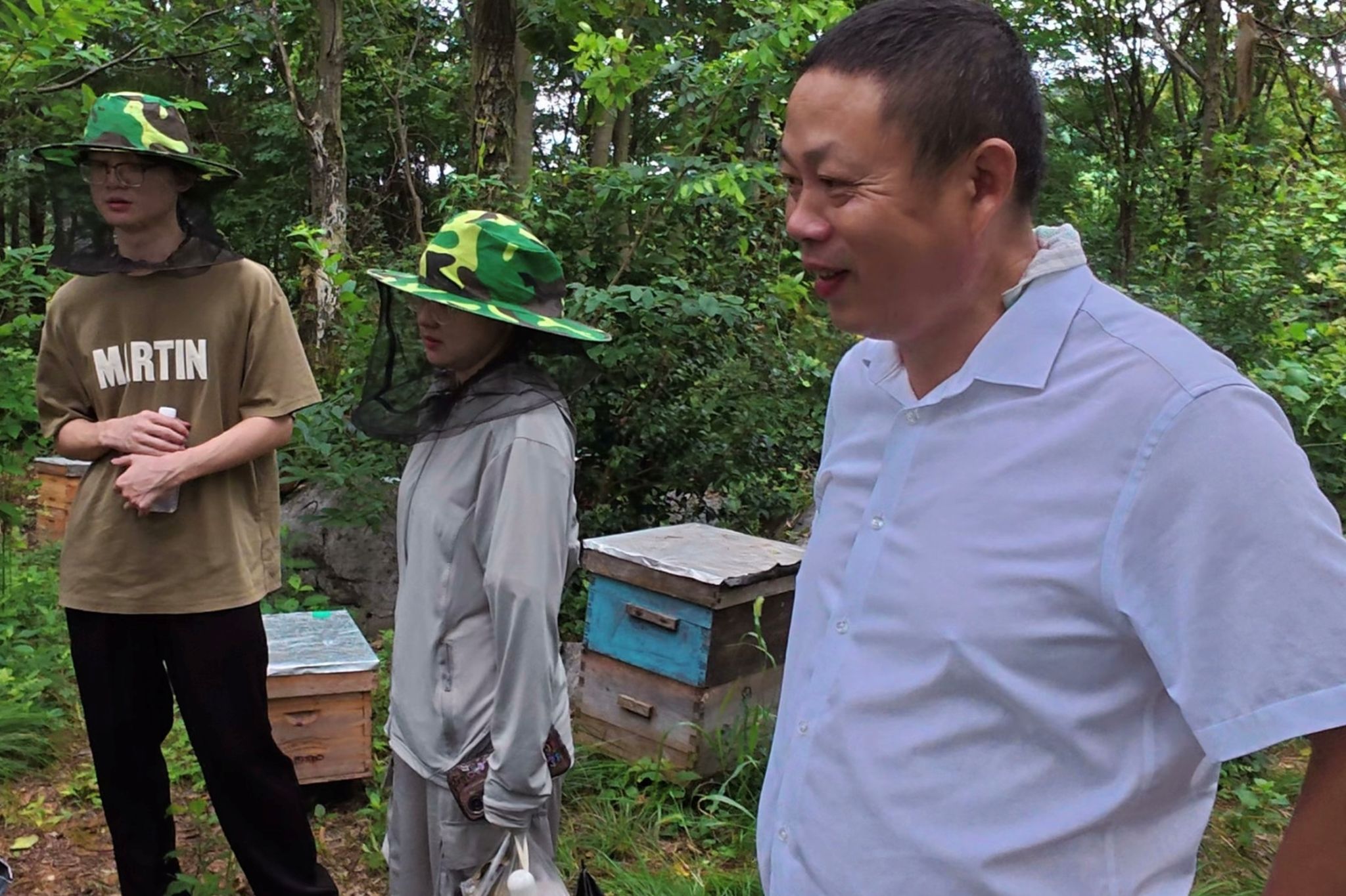 此外,团队还走进养蜂示范场与山区蜂场,近距离学习蜂业知识。在养蜂示范场,成员了解到中华蜜蜂与意蜂蜂蜜的差异;在山区蜂场,实践团观察蜂箱选址与摆放规范,学习蜂群状态观察方法,见证工蜂携粉归巢的场景,系统了解蜂蜜从采集到成熟的全链条生产流程。这些实践让团队直观认识到蜂产业中人与自然协同共生的重要性,也将专业认知从理论层面延伸至生产实践。