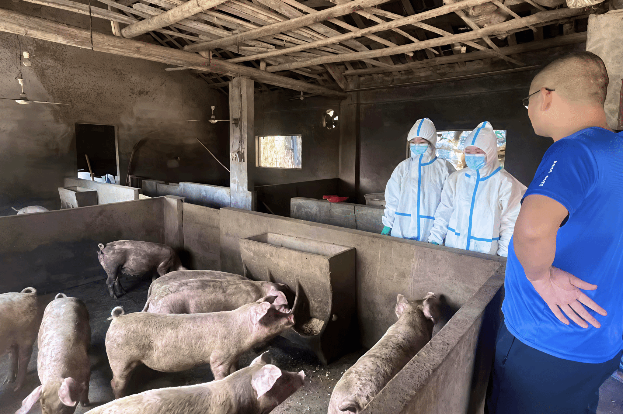 实践团预调研小组成员蒋晶晶与郭其琪已预先完成淋浴消毒、隔离和病原检测,然后在养殖户李加胜的引导下,依次规范穿戴防护服、口罩、鞋套及手套,进入其家庭猪舍。该猪舍规模较小,猪食槽沿中间通道一侧排布,便于饲料投放;猪圈底部设排污口与化粪池直接连通,实现粪污集中处理,展现小型养殖户的实用养殖方式。