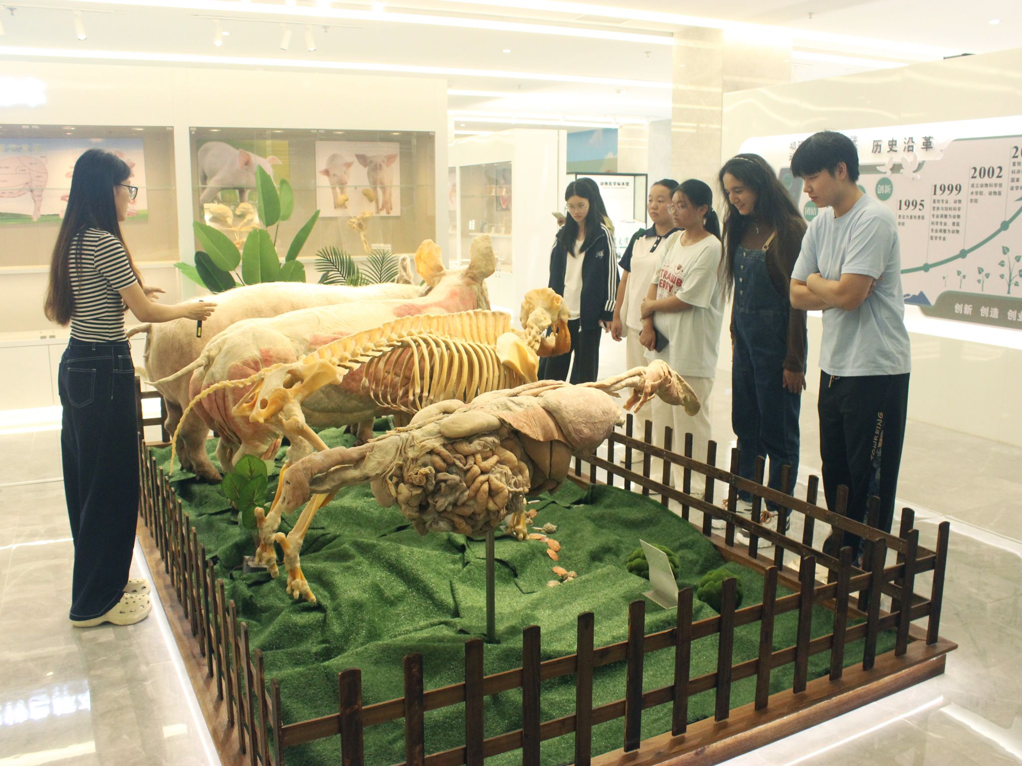 其中,1972年湖北白猪四件套标本成为活动焦点。这套“镇馆之宝”运用生物塑化技术,通过同体拆分工艺完整呈现猪的内脏、骨骼、肌肉与皮肤结构。杨旭晨现场拆解技术流程:从福尔马林固定定型,到丙酮脱脂脱水,再经真空环境下多聚物置换、加热塑化成型。该技术不仅消除了传统标本刺激性气味,更让参观者能直观且清晰地观察动物的生理结构与形态特征。 “透过生物塑化标本,我们得以与生命进行跨时空对话。”动医2404班许冰堑在活动后分享道,“这些标本不仅巩固了专业知识,更激发了我对生命的敬畏之心。”