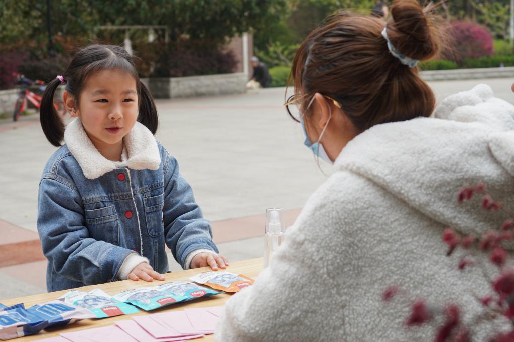 志愿者与青志工作人员分为两组,分别在华农西社区的党员群众服务中心与西苑社区广场进行展位布置,开展养宠居民有奖答题的互动。志愿者们将文明养宠的资料制作成难易程度不同的三类卡片,供前来参与活动的居民抽取回答。