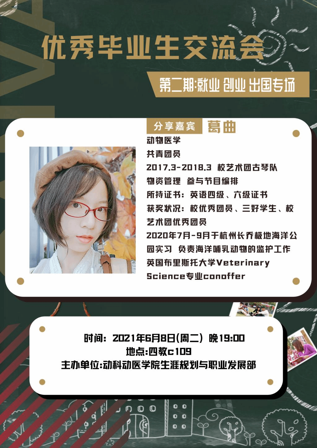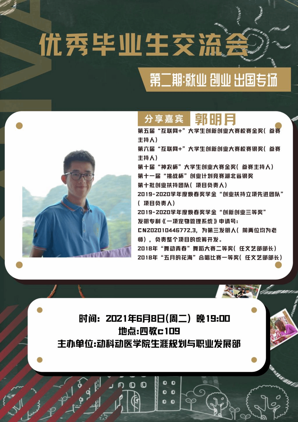 六月四日与六月八日晚上七点将分别在四教C110、C109举办优秀毕业生交流会两个专场,第一个专场为考研、保研专场,第二个专场为就业、创业、出国专场,我们有幸请到杨思齐、翟明丽、匡磊、葛曲、郭明月、官鑫六位学长学姐进行交流分享。本活动旨在引导同学们学习借鉴在各方面取得优异成绩的优秀毕业生的经验和方法,从而为自己的大学阶段发展设定更细致可行的规划,并促使大家能脚踏实地完成自己的规划,为未来人生发展奠定基础。
