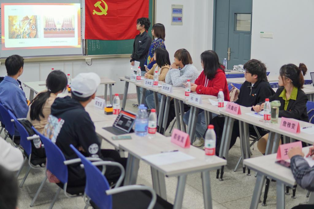 党建督察部于四教C401开展以“百年党史,红色传承”为主题的预备党员中期答辩。本次中期答辩由党建督察部志愿者余舟彤、吴素琴主持;辅导员王运涛,正式党员詹雅雯、周鑫钰、都俊嵩担任评委出席本次答辩。