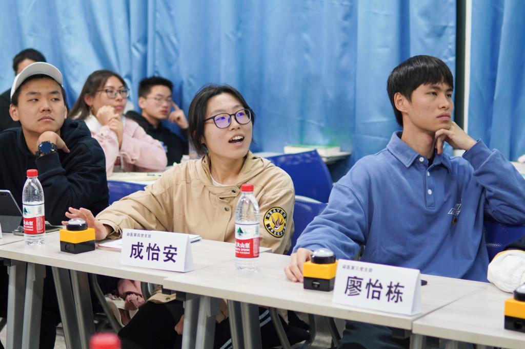 抢答环节中,九个党支部分为两组,需在规定时间内快速思考,回答问题。活动伊始,第一组的廖怡栋率先抢答成功,并回答正确;而动医第五党支部吕品一后来居上,第二组的动医第六党支部王珂婷也积极作答,两人答对近三分之一的题目,充分展现出夯实的理论基础。