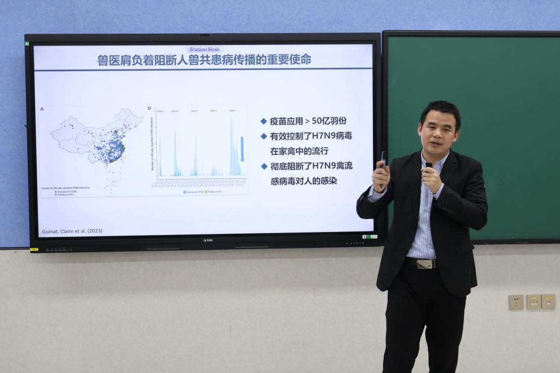 首先,彭贵青教授讲述自身与兽医行业的缘起,回顾自己少时往事和求学经历,使同学们产生了浓厚的兴趣。关于兽医与“全健康”的关系,彭贵青教授以傅振芳教授立志攻克狂犬病、陈焕春院士检测出猪二型链球菌病以及兽医工作者在埃博拉病毒控制中发挥重要作用等为例,明确了“人病兽防”的重要观点。他强调,“兽医学是保障动物和人类健康的重要学科,兽医肩负着阻断人兽共患病传播的重要使命”。此外,他还提到宠物对人类健康也存在着重要影响。