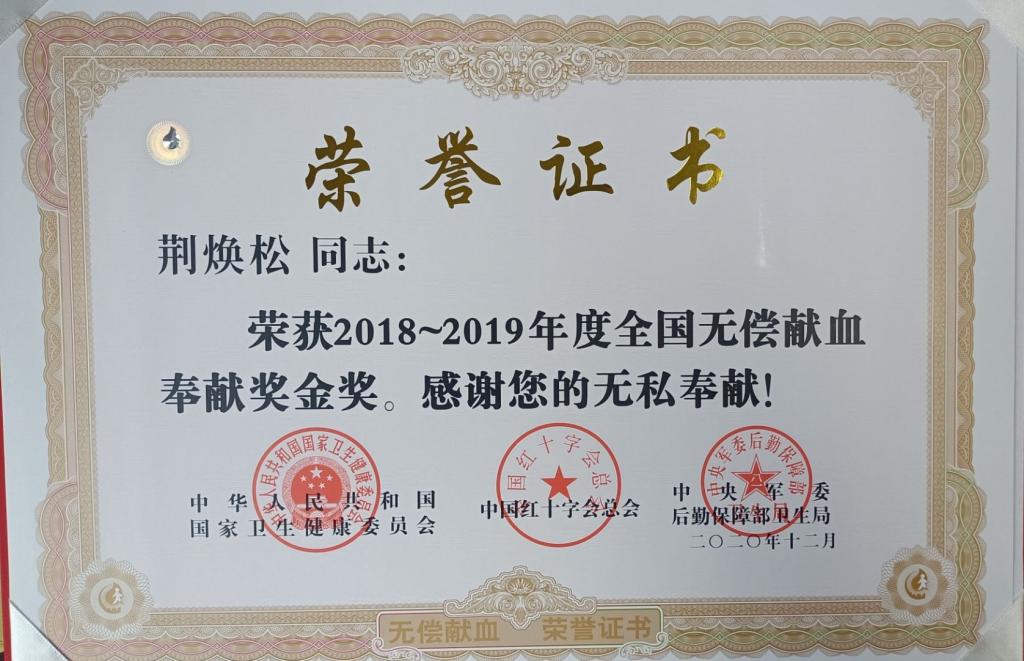 19级硕士研究生荆焕松积极响应国家号召,曾在两年内多次献血,其中全血800mL、血小板超过40个治疗量,获得了国家卫生健康委员会、中国红十字会总会和中央军委后勤保障部卫生局共同授予的“全国无偿献血奉献奖金奖”荣誉。