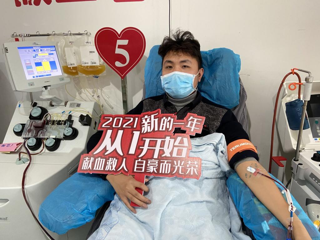 金焕松:我第一次献血是在学校,献的全血,不是很紧张,过程也比较快。其实,献血是我一直想做的事。我从18岁时起就有献血的意愿,后来在两年内献了800mL的全血、超过40个治疗量的血小板。捐献全血,两次之间最短间隔是半年;成分献血,以血小板为例,两次之间最短间隔是两周,一次最多两个治疗量。
