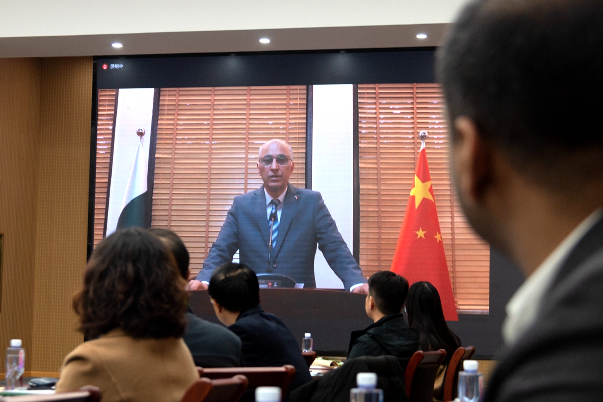 巴基斯坦驻华大使Moin ul Haque线上致辞(学通社记者 吴渺 摄)