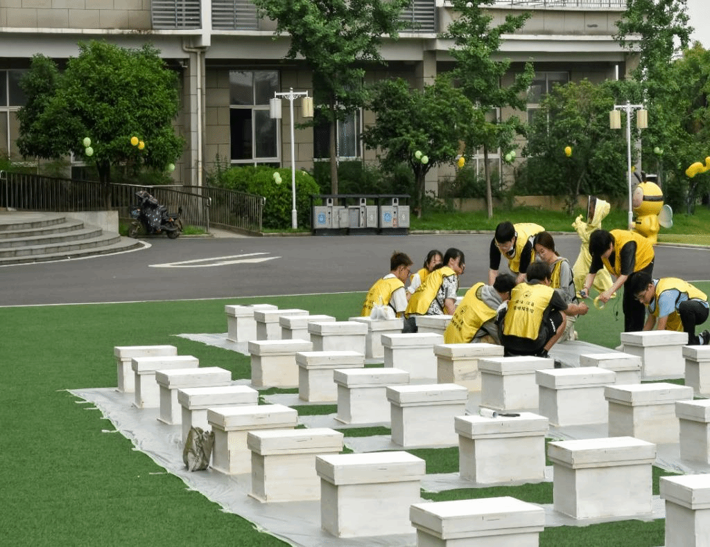 实验蜂场实习的本科生志愿者对活动现场进行了精心的布置并做好相关准备工作以确保活动的顺利进行。本次活动场馆设置了割蜜尝蜜、活蜂体验、科普馆参观、蜂箱制作等活动,引导现场小朋友们走进“蜜蜂王国”,探索蜜蜂知识。