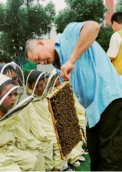 “老师,自己收集的蜂蜜真的好甜呀!”前来参与割蜜尝蜜活动的小朋友们异口同声地夸赞道。在割蜜尝蜜活动中,老师给孩子们展示了蜜蜂的巢脾,小朋友们也化身蜂农,通过对摇蜜机等机具的了解,自己动手收集蜂蜜,完成割蜜、摇蜜。随后,志愿者们为小朋友们穿上防蜂服,“小小蜂农”近距离去观察蜂农爷爷从蜂箱中取出的蜂脾。“老师,我也要看蜂王!”小朋友们第一次看见几千只蜜蜂聚集在一起,激动的心情难以言表。在观察的同时,志愿者对蜜蜂蜂群的组成、蜂王辨别方法进行了详细的介绍。在和小朋友互动过程中,工作人员和孩子们谈到了蜜蜂身上“勤劳”“奉献”“团结”三个值得人类学习的品质。