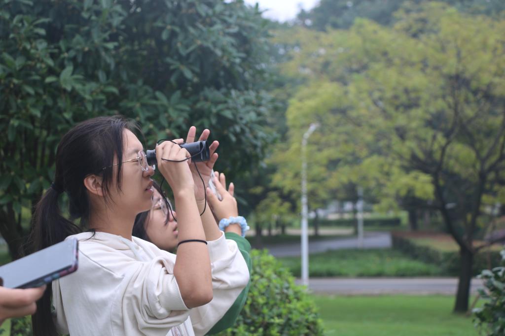 10月4日清晨,在硕士研究生李鸿屹和志愿者们带领下,狮山观鸟活动正式开始,参加活动的同学们从二十四节气园出发,观察校园周边栖息的鸟类。