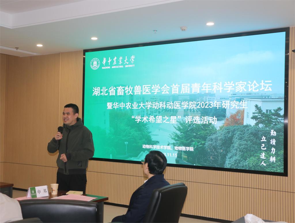 第四综合楼D207会议室举行。华中农业大学动物科学技术学院、动物医学院副院长彭贵青教授,南京农业大学动物医学院副院长平继辉教授,扬州大学兽医学院刘源教授,华中农业大学动物科学技术学院、动物医学院周翔教授应邀出席本次论坛。论坛由湖北省畜牧兽医学会常务理事、华中农业大学国际合作与交流部副部长申邦教授主持。