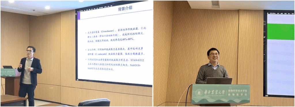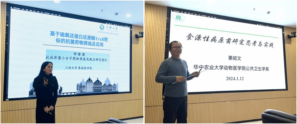 会议先后由赵凌教授和刘梅副教授主持。谢书宇教授进行了欢迎致辞,并介绍了学院和学科现状。学术报告环节,邹黎黎教授聚焦氧化还原Redox系统在细胞代谢中的关键作用,以硫氧还蛋白还原酶TrxR为靶标进行了药物筛选基础与应用研究,取得了以Ebselen为代表的药物研发突破性成果;栗绍文教授介绍了兽医公共卫生学科的发展历程及建设情况,分析了食源性病原菌领域需解决的关键问题及研究思路,汇报了团队在食源性病原菌风险监测与源头防控等方面取得的主要成果;谢书宇教授从提高兽药靶向性和利用率对绿色养殖的重要性出发,详细介绍了利用纳米、复合纳米等高效吸收递送系统进行靶向感染部位、生物被膜及胞内菌的精准治疗策略,以及分子印迹型MOFs材料在环境污染净化方面的应用;三峡大学汪露博士以基因组学在克罗诺杆菌中的应用为题,分享了在克罗诺杆菌致病机制、序列分型工具研发、Marker genes筛选及鉴定方法等方面取得的主要成果。