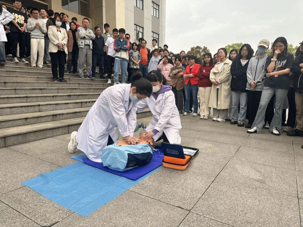 当师生都安全疏散到大楼南侧时,校医院两名医护人员通过模拟人体进行心肺复苏操作演练,现场展示正确的括胸外按压的位置、频率和深度,以及人工呼吸的技巧,并指导师生在模拟人体上进行心肺复苏的实际操作练习。