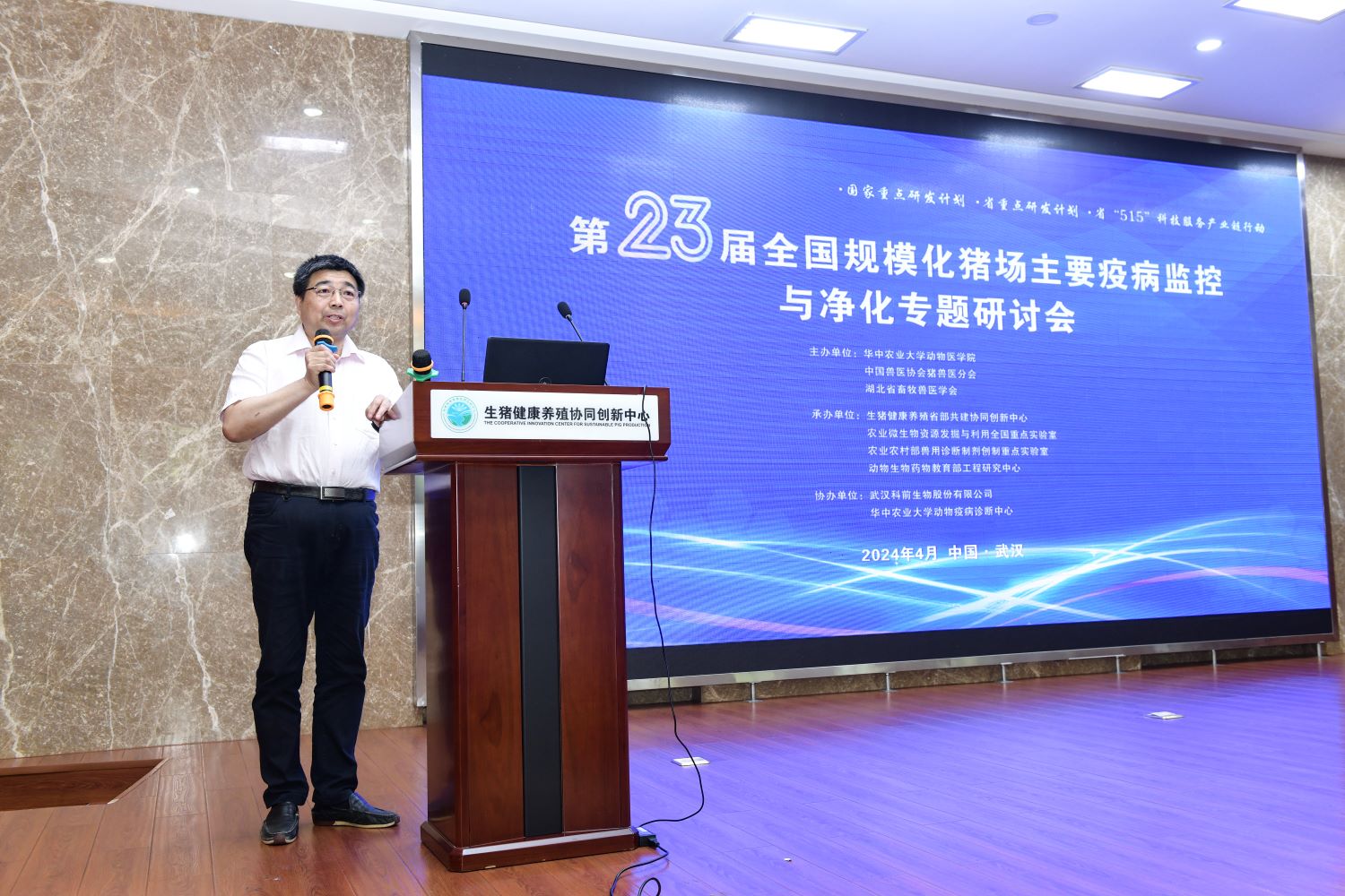 雷贤忠在开幕式致辞中表示,一年一度的全国规模化猪场主要疫病监控与净化专题研讨会是我国养猪业的盛会,感谢华中农业大学为养猪人搭建此学习交流平台,让大家有机会共同研讨猪病防治策略,交流行业最新动态,分享养猪实践经验,展示养猪科技成果,结交志同道合的伙伴,携手共谋养猪业发展。