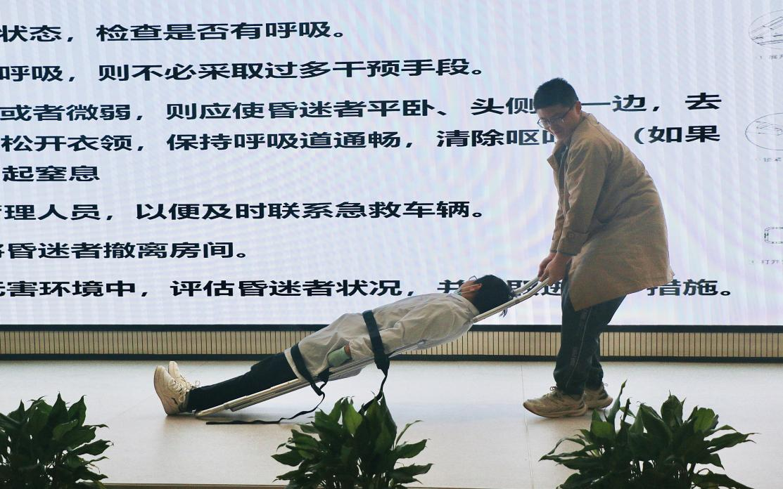 在培训的最后,陈西详细讲解了在发生溢撒、动物抓伤咬伤、动物逃逸、人员晕倒等事故时的应急处理措施,并对人员晕倒如何紧急处理进行了现场演练,在座师生踊跃参与,切身体验了急救措施。