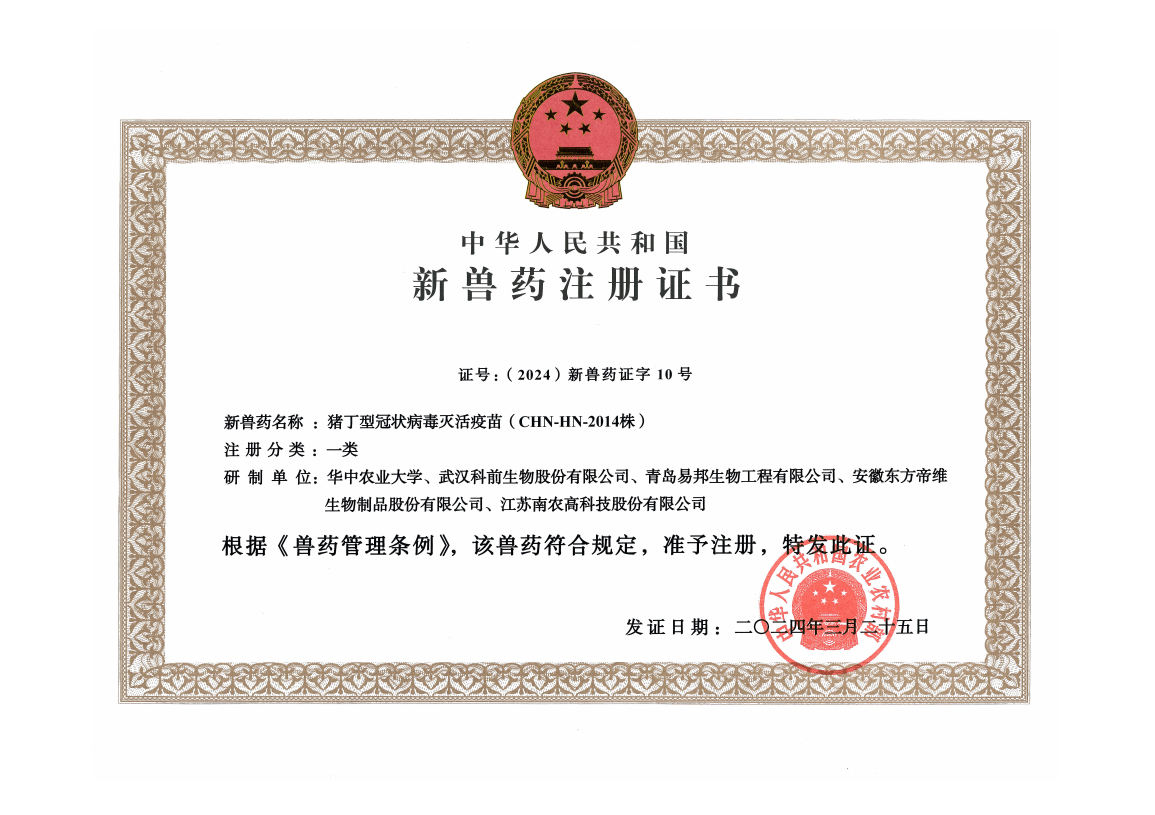 ▲肖少波教授主持研发的猪丁型冠状病毒灭活疫苗获批国家一类新兽药证书