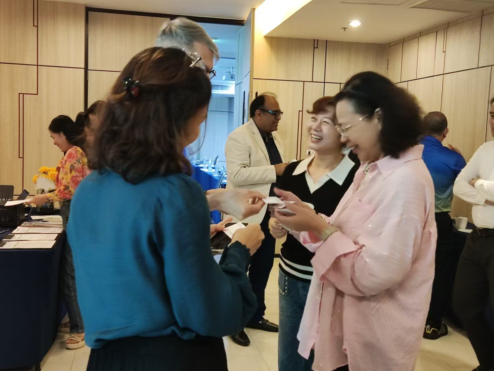 (郭爱珍教授和陈颖钰副教授与外国专家互换名片)