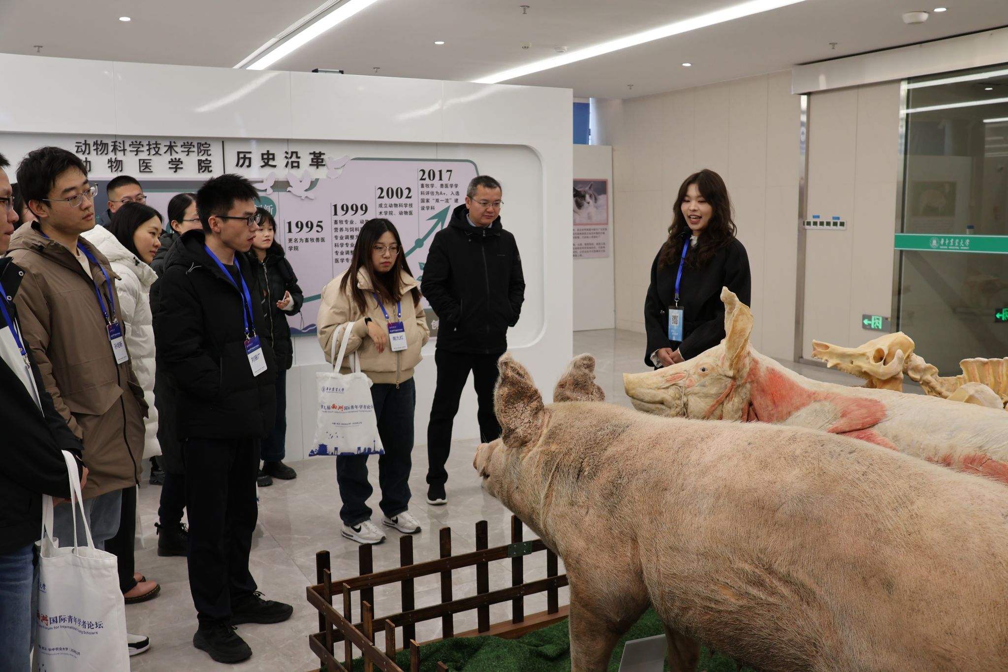 随后,与会学者在学院副院长胡丽华的带领下,参观了学院的校内相关基地平台等,深入了解了学院在教学、科研和成果转化情况。动物医学标本馆讲解团成员张可欣同学、学院张霞老师、吴烨婷老师、胡军勇老师、刘小磊教授、李钰老师、刘振利研究员和杨春荣老师分别对动物医学标本馆、元宇宙教室、公共实验平台、农业农村部种猪质量监督检验测试中心(武汉)、正在建设中的智能养殖基地、动物教学医院、实验动物中心等学院教学基地和平台进行介绍。参观过程中,大家对学院先进的实验设施、丰富的科研成果以及产学研一体化的办学特色表示高度赞赏。